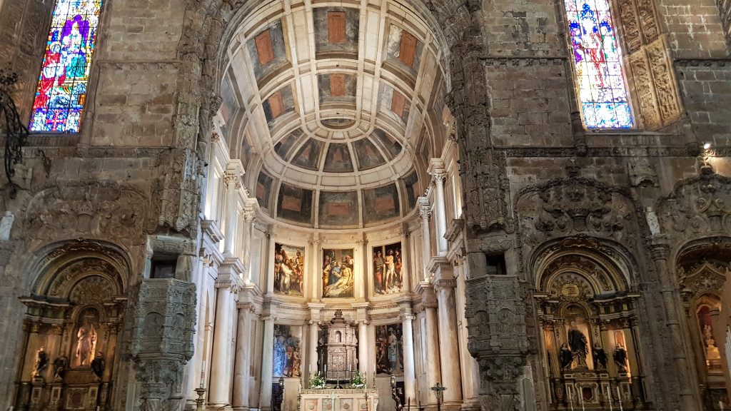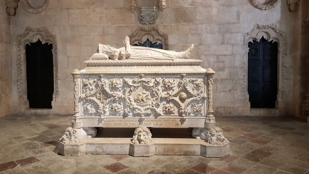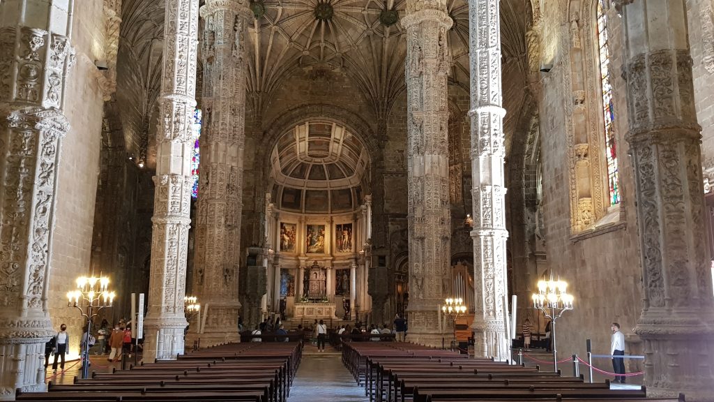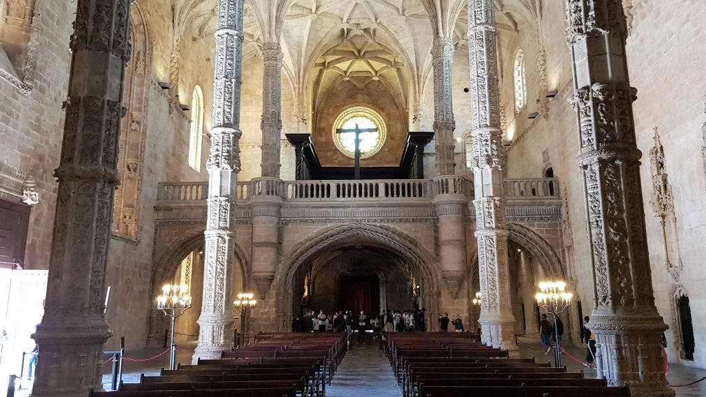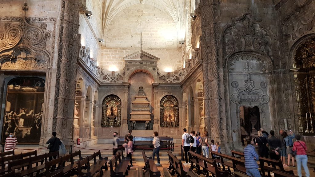 A Igreja de Santa Maria de Belém é uma igreja com planta em cruz latina, o que significa que a nave principal apresenta um maior comprimento em relação ao transepto. Logo na entrada encontram-se os túmulos de Camões (à direita) e de Vasco da Gama (à esquerda). Na parte esquerda do transepto estão os túmulos do Cardeal-Rei D. Henrique e os dos filhos de D. Manuel I. No braço direito do transepto encontra-se o túmulo do Rei D. Sebastião e dos descendentes de D. João III. Na capela-mor estão os túmulos de D. Manuel e de sua mulher, D. Maria, de D. João III e de D. Catarina.