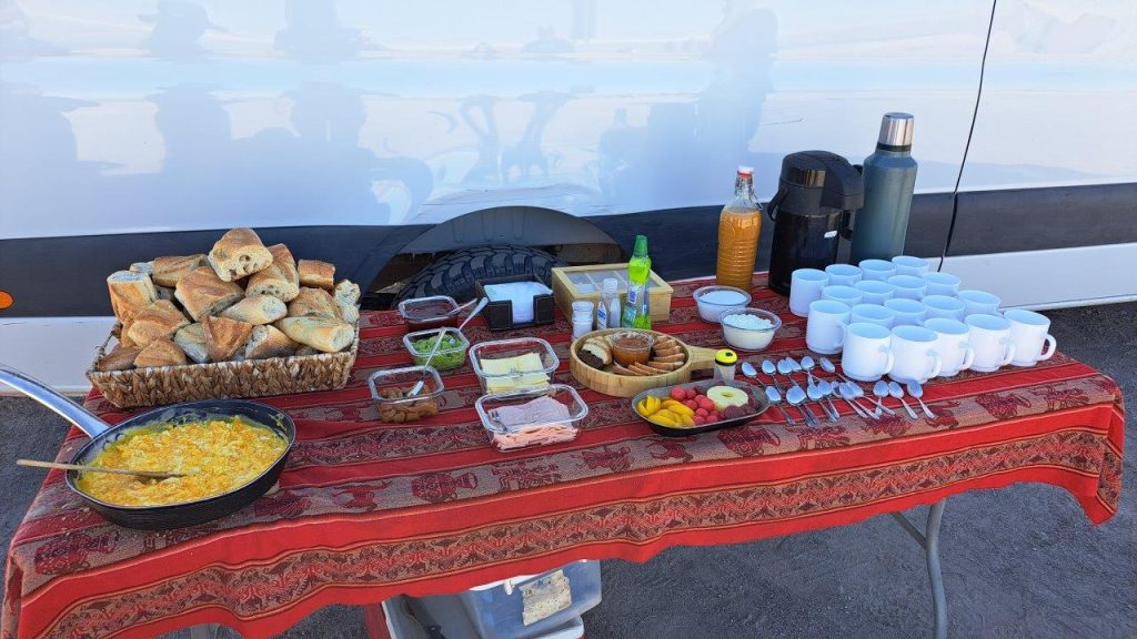 Tiramos muitas fotos enquanto nossos guias preparavam um café da manhã ao lado da van em um pequeno estacionamento. O café foi servido por volta de 10h30.