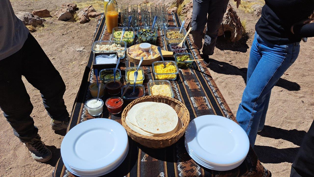 Em todos os passeios no Deserto do Atacama, os guias preparam uma bonita mesa de café da manhã, almoço ou lanche, conforme o horário do tour. Quase todos os passeios são realizados dentro de reservas controladas pelos povos originários da região, onde não é permitido entrar com alimentos ou bebidas. Por este motivo, os piqueniques são montados em algum local fora dos parques. Cada guia já tem seu lugar predileto, escolhido a dedo em algum ponto belíssimo da região visitada. A comida é sempre saborosa e fresca.